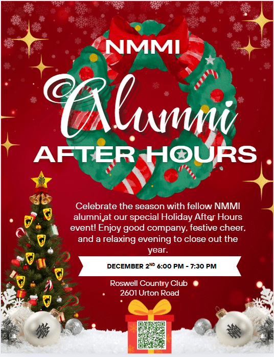 NMMI Alumni After Hours – December 2nd 2025 Tuesday, December 2, 2025 Roswell Country Club Reconnect, relax, and raise a glass! 📍 Roswell Country Club | 🕕 6–7:30 PM RSVP